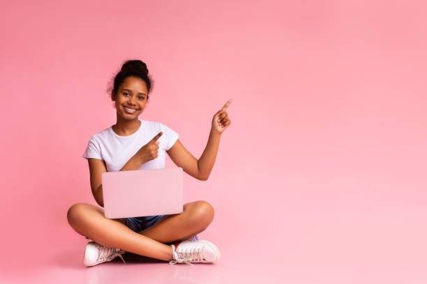 Excited African American Teenager With Laptop Pointing At Free Space On Pink Background.